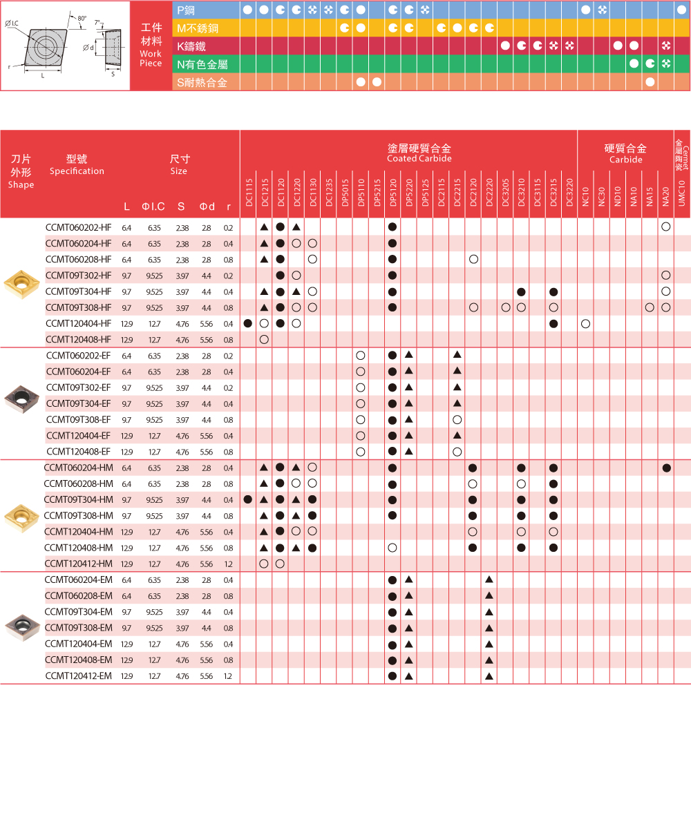 | Insert Grades - Turning 車削刀片牌號一覽表 |
