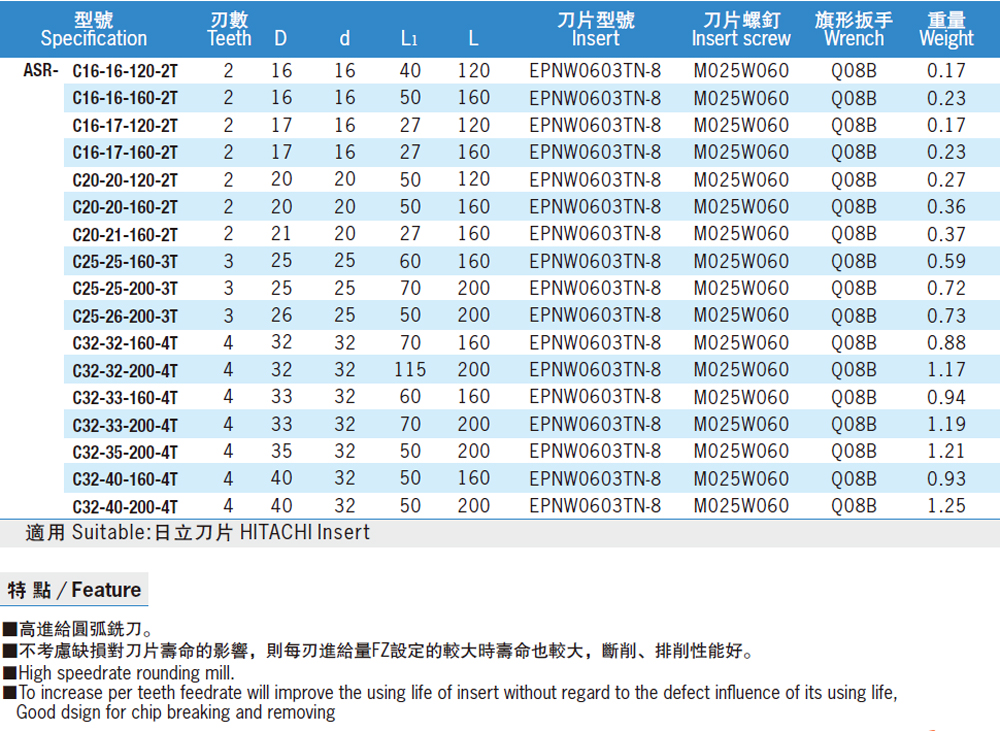 | ASR Screw-on Cutter for High-feed Milling ASR鎖牙式大進給端銑刀頭 |